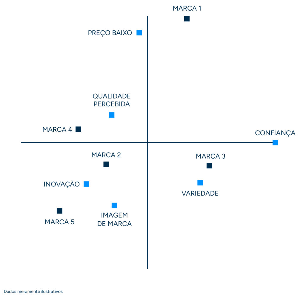 A abordagem comparativa permite posicionar o benchmark do mercado, medir as distâncias entre marcas e identificar o centro de gravidade competitivo, evidenciando os atributos verdadeiramente distintivos de cada marca.